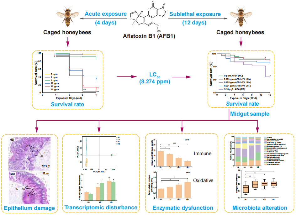 162026/01亚致死剂量黄曲霉素B1对西方蜜蜂具有多维毒性效应近日,中国农业科学院蜜蜂研究所熊蜂繁育与授粉应用团队综合运用组织形态学、转录组学和宏基因组学方法,系统揭示了亚致死剂量黄曲霉素B1暴露对西方蜜蜂中肠的多维损伤效应,深入阐述了黄曲霉素B1对蜜蜂健康的潜...