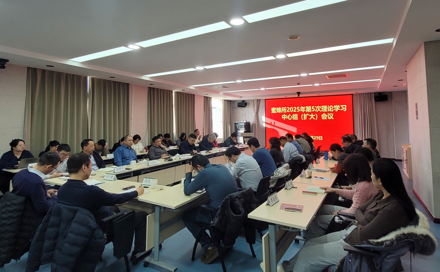 12月29日,中国农业科学院蜜蜂研究所召开理论学习中心组(扩大)会议,学习《加快建设农业强国规划(2024-2035年)》、中央一号文件等关于粮油作物大面积单产提升的部署要求,传达农业农村部、中国农科院领导《关于将蜂授粉纳入高产栽培主推技术 促进油料大面积单产提升的建议》的重要批示精神,并结合研究所当前实际开展交流研讨。会议由蜜蜂所副所长田文礼主持,中层及以上干部、团队首席、支部书记、青年理论学习小组组长及相关科研团队成员等50余人参加。