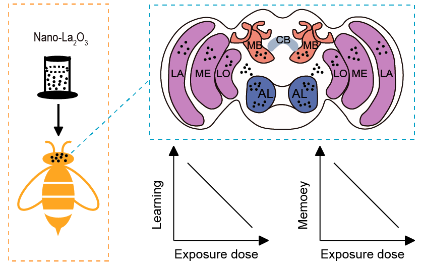 近日,中国农业科学院蜜蜂研究所联合中国科学院生态环境研究中心等单位,揭示了纳米氧化镧(nano-La₂O₃)可通过侵入蜜蜂脑,诱发蜜蜂神经元凋亡,下调与学习记忆相关的基因表达,从而显著损害蜜蜂的认知行为和生理健康。相关研究成果发表在《环境科学:纳米(Environmental Science: Nano)》上。