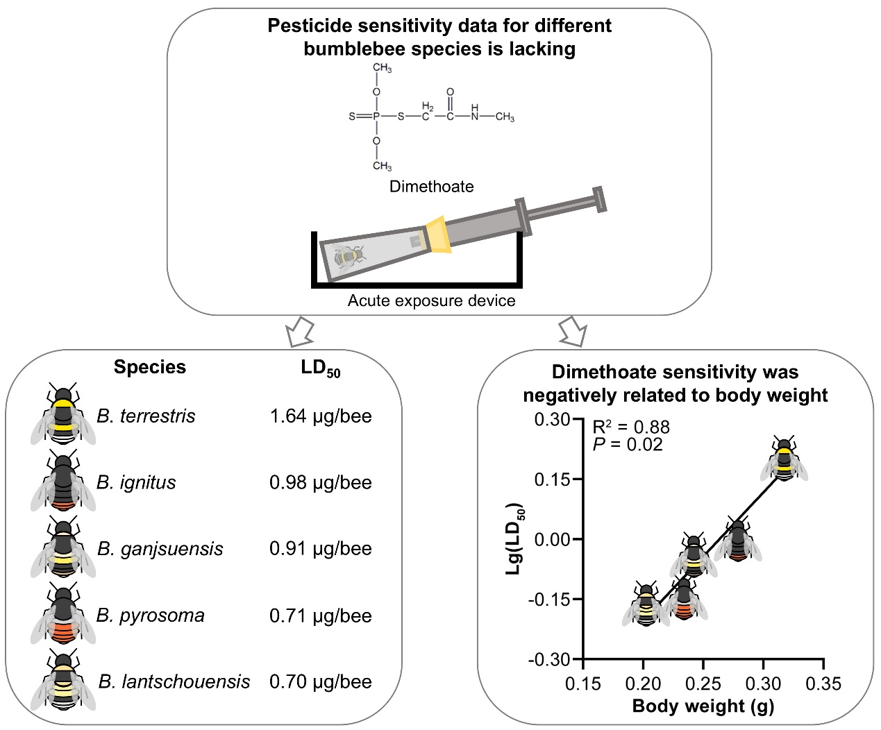 熊蜂是众多野生植物和农作物的重要传粉者,但其健康和传粉效率受农药影响很大。目前大多数农药与熊蜂的研究都聚焦在商业化人工饲养的欧洲地熊蜂Bombus terrestris和美洲燥熊蜂B. impatiens,缺乏更多野生熊蜂物种的数据。乐果是一种广谱的有机磷杀虫剂,可在特定的农作物、林业和花卉上使用,同时也是农药风险评估中的阳性对照。本研究通过将农药急性毒性测试扩展至中国近年来繁育成功的野生本土熊蜂物种,分析了五种熊蜂对乐果的敏感性差异,筛选了预测乐果敏感性的潜在形态指标。