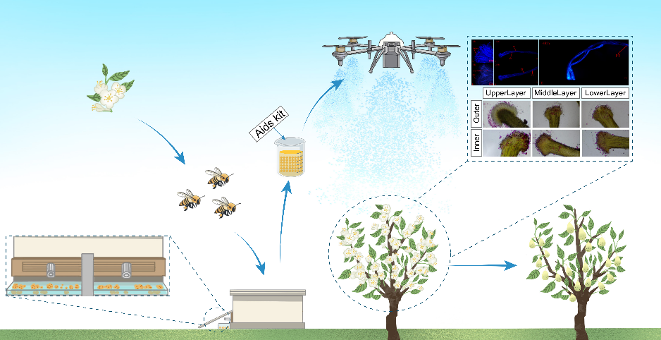 针对上述关键技术瓶颈,研究人员以解决果树授粉重大生产需求为导向,自2018年起系统开展相关技术研发与示范应用。研究团队首先聚焦蜜蜂在花粉采集方面的专一性与高效性,利用专有技术破解了蜜蜂采集花粉活力难以维持的技术难题,拓宽了蜜蜂采集花粉的应用范围。并以花粉柱头萌发过程中需要的物质基础为依据,研发了相应的花粉助剂,显著提升了花粉在液体体系中的分散均一性和稳定性,解决了花粉易沉降和团聚的问题,实现了蜜蜂花粉与喷施机械的高效匹配。同时,研究团队还筛选鉴定出一种能够促进花粉管伸长的植物免疫蛋白,加入该蛋白可使蜜蜂采集花粉的活力提高10%以上,并在花粉管伸长初期显著加快其萌发与伸长,有利于加速花朵坐果。多年田间试验结果表明,该技术授粉效果稳定可靠,花序坐果率可高达79.94%,花朵坐果率达48.76%,展现出良好的应用潜力。该研究为突破传统授粉技术瓶颈、缓解果树授粉压力以及促进果树生产绿色可持续发展提供了新的技术路径,也为果树授粉模式创新提供了重要参考。