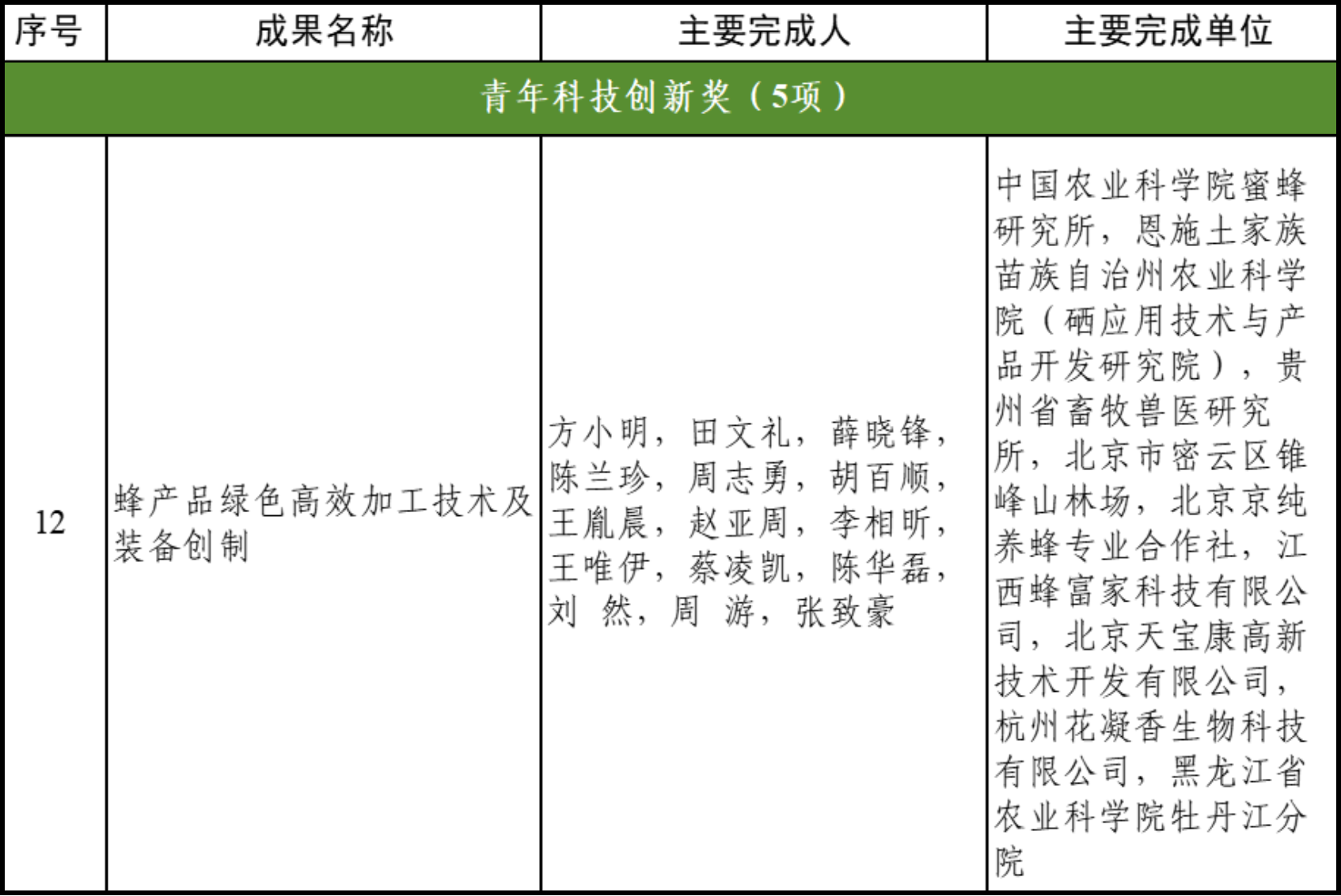 近日,中国农业科学院蜜蜂研究所资源昆虫产品加工与功能评价团队主持完成的科研成果《蜂产品绿色高效加工技术及装备创制》获2025年度中国农业科学院青年科技创新奖。该成果由蜜蜂研究所与贵州省畜牧兽医研究所、恩施土家族苗族自治州农业科学院、杭州花凝香生物科技有限公司等9家单位共同完成。