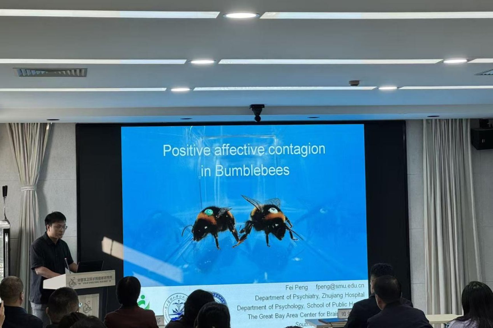 彭飞作题为《熊蜂的积极情绪传染》的报告,为大家详细介绍了熊蜂情感传染的机制,并提出此机制可能普遍存在于社会性脊椎动物以及社会性昆虫中,为研究社会认知的起源提供了崭新视角。田里、文超、葛瑨、周雍和分别围绕熊蜂拟态的演化机制初探、地熊蜂拉绳认知行为研究、熊蜂工蜂生殖的群体感应、熊蜂基于花蜜属性的觅食决策等主题作了精彩报告。